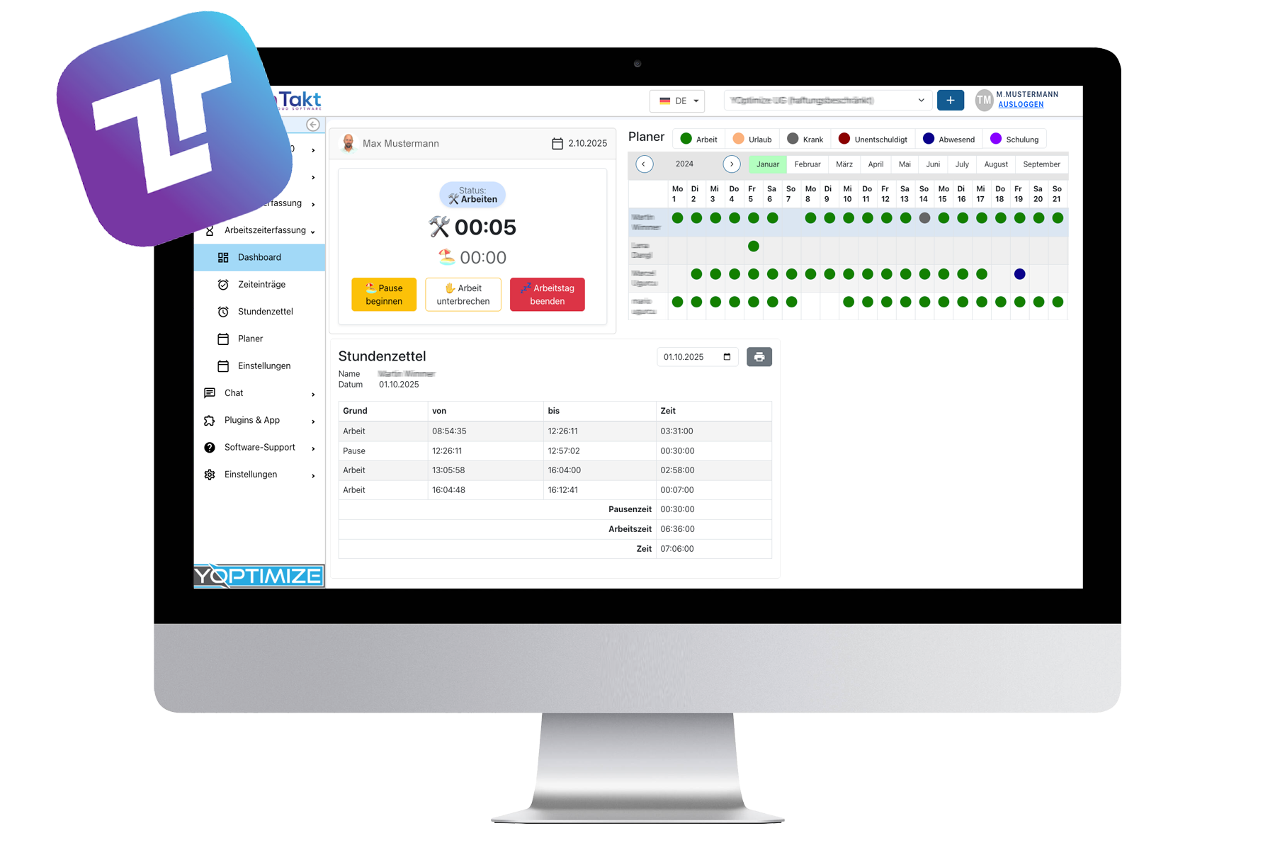 Das Arbeitszeiterfassungs-Modul von TeamTakt ist mehr als nur eine digitale Stechuhr. Es ist ein leistungsstarkes System für moderne Arbeitszeitverwaltung – einfach zu bedienen, flexibel anpassbar und rechtssicher. Starte jetzt mit smarter Zeiterfassung und bring Struktur, Transparenz und Effizienz in dein Unternehmen.